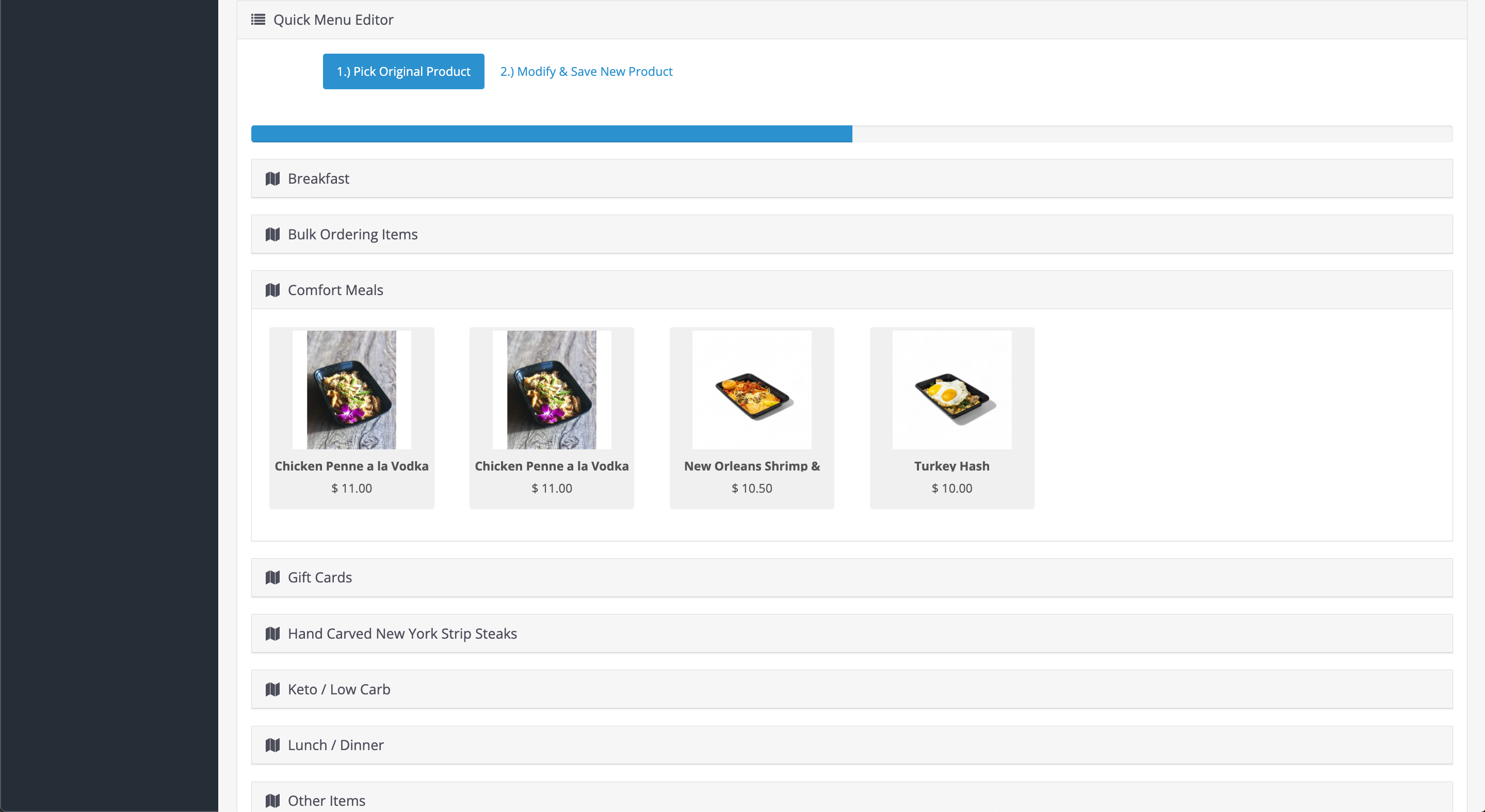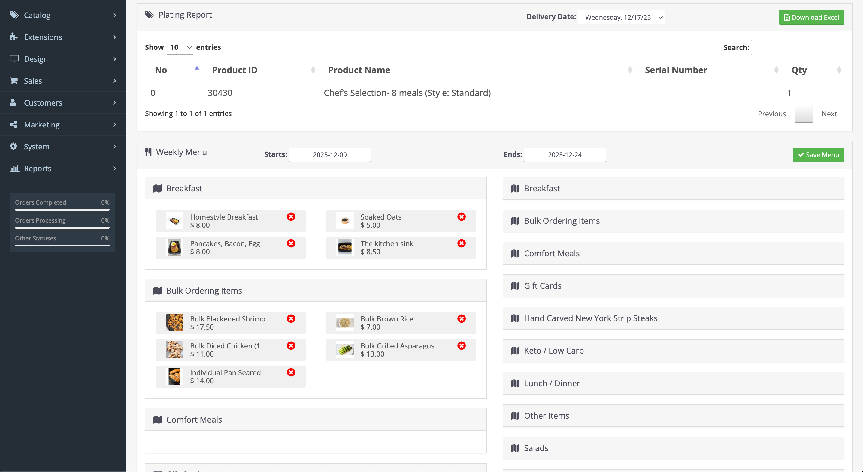 We started with creating a database of their existing menu, including all variants along with their pricing and images. In parallel, we also created a database for their loyal client base. We then collaborated with the Chef and his leadership team to design a system that can accomodate a revolving weekly menu according to demand/marketing/inventory.